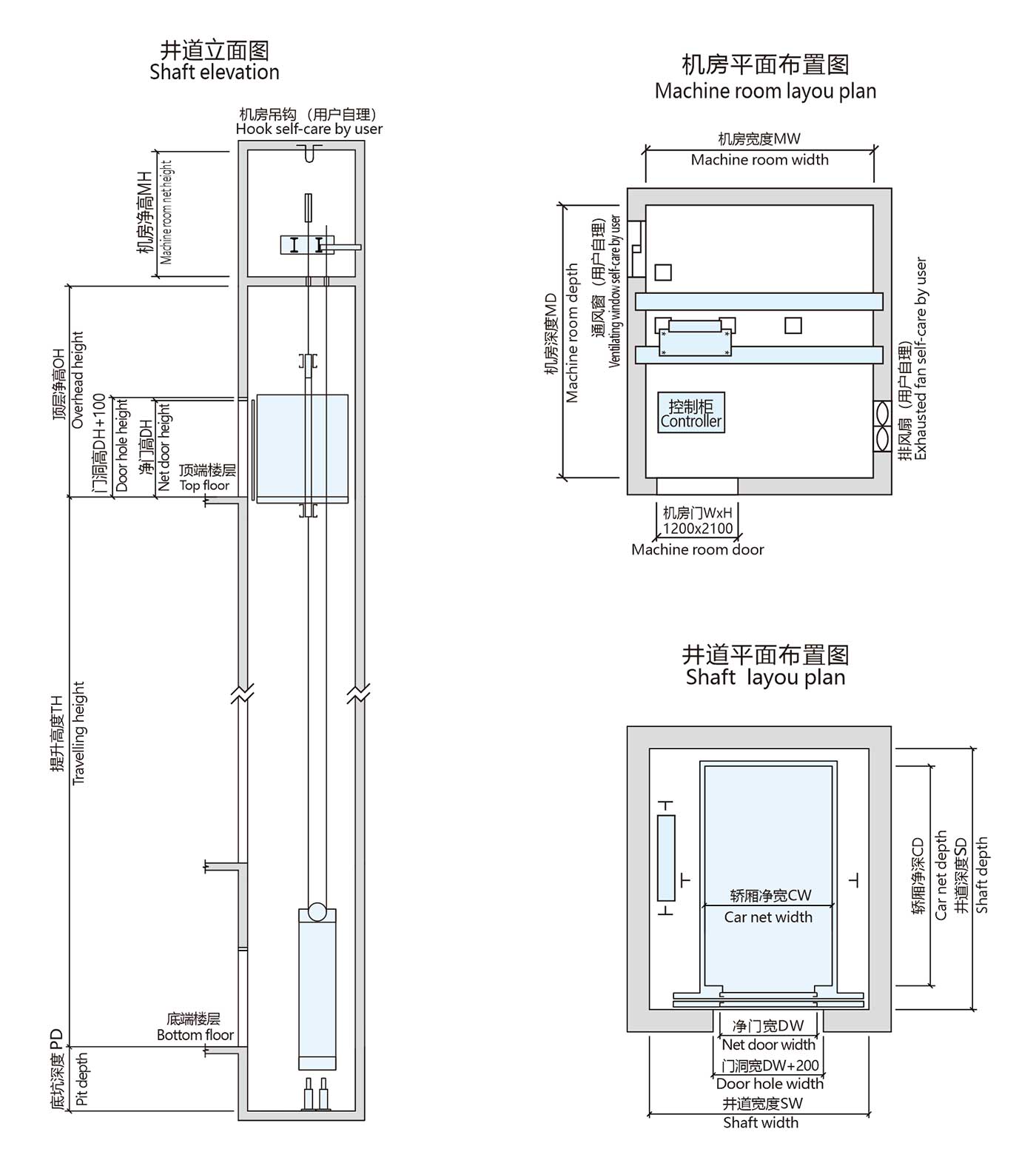 | Rated capacity (kg) | Persons | Rated speed (m/s) | Net size of car (mm) | Net door size (mm) | Hoistway size (mm) | Machine room size (mm) | ||